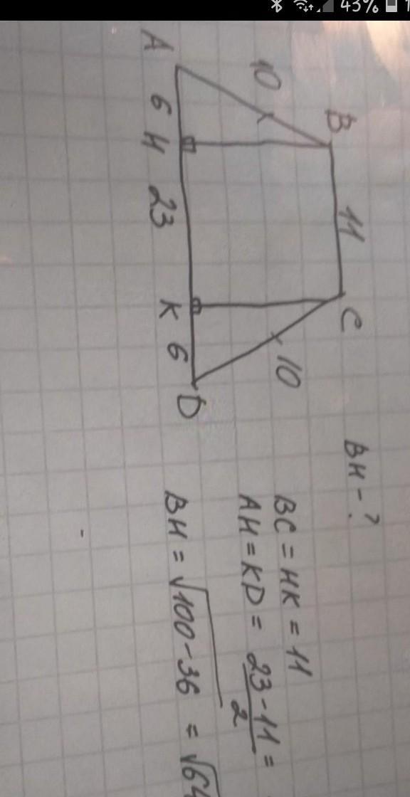 основания равнобедренного трапеции равны 10дм и 22дм, боковая сторона - 10дм.Найдите высоту трапецыии.