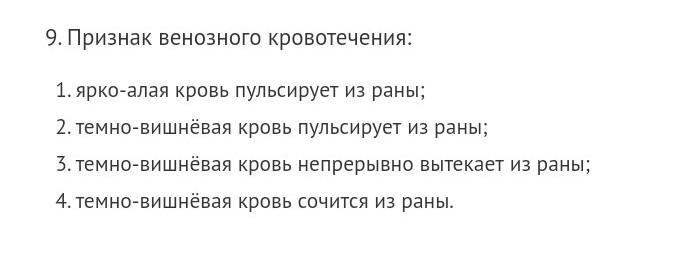 3. темно-вишневая кровь непрерывно вытекает из раны