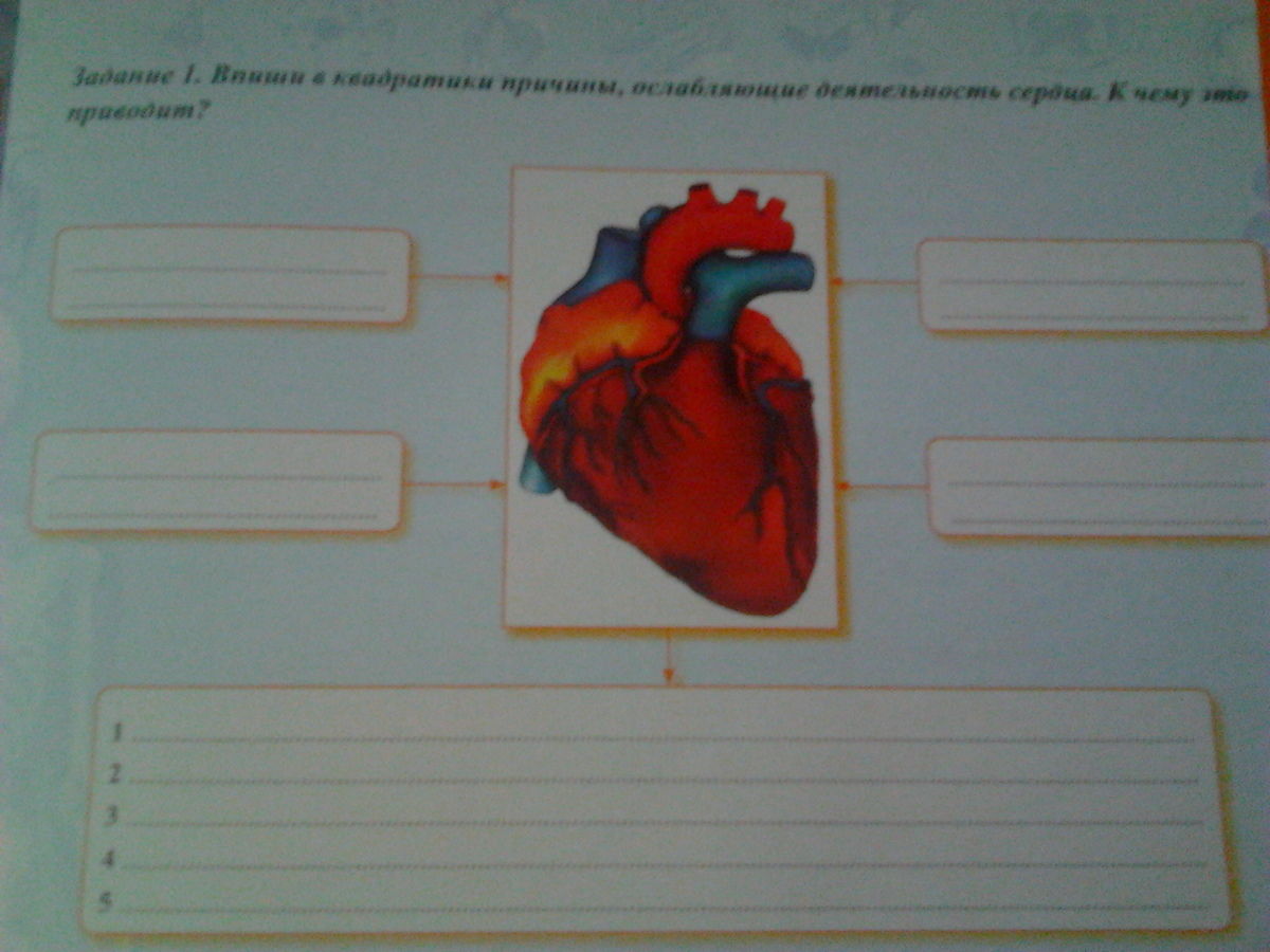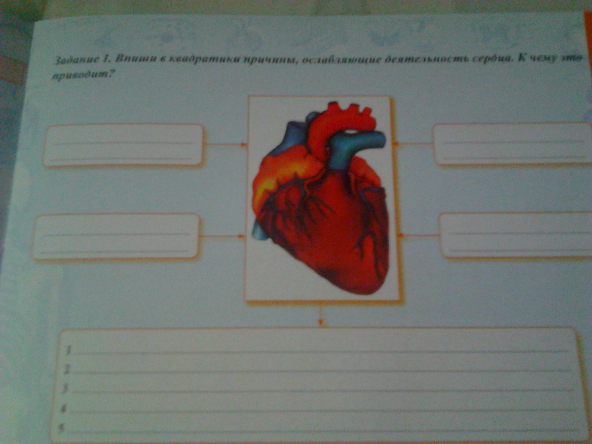 Впиши в квадратики причины,ослабляющие деятельность сердца,К чему это приводит?