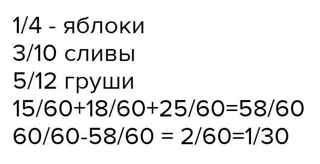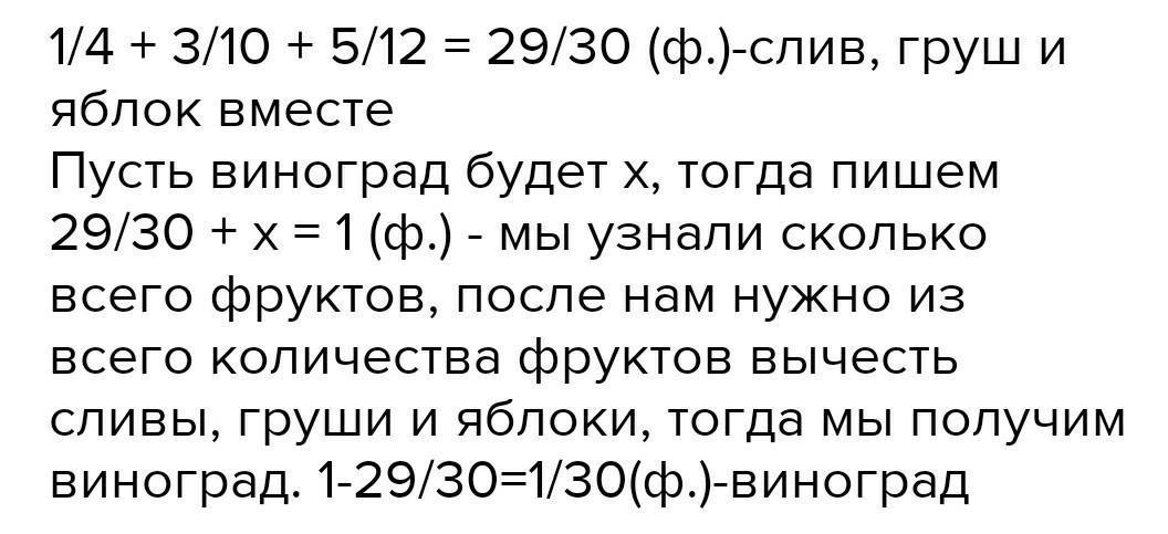 В магазин завезли фрукты. яблоки составили 1/4, сливы 1/10, а грушин 412 всех завезенных фруктов. остальное завезеный товар составил виноград. какую часть всех фруктов составил виноград.