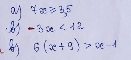 1) 7x>=3.5|: 7 x>=0.5 2) -3x<12|: (-3) x>4 3) 6(x+9)>x-1. 6x+54>x-1 відомі в право не відомі в ліво 6x-x>-1-54 5x>-55|: 5 x>-11