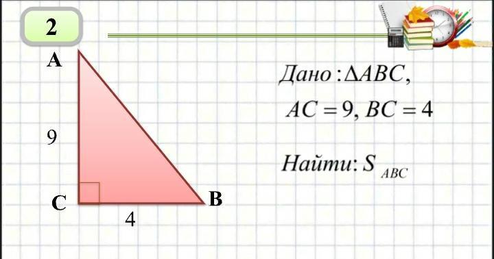 1. S(ABC)=1/2*BC*AC = 1/2*4*9=18 кв.ед.