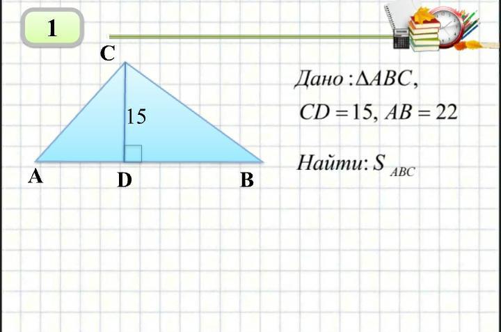 2) S(ABC)=1/2*AB*CD=1/2*22*15 = 165 кв. ед.
