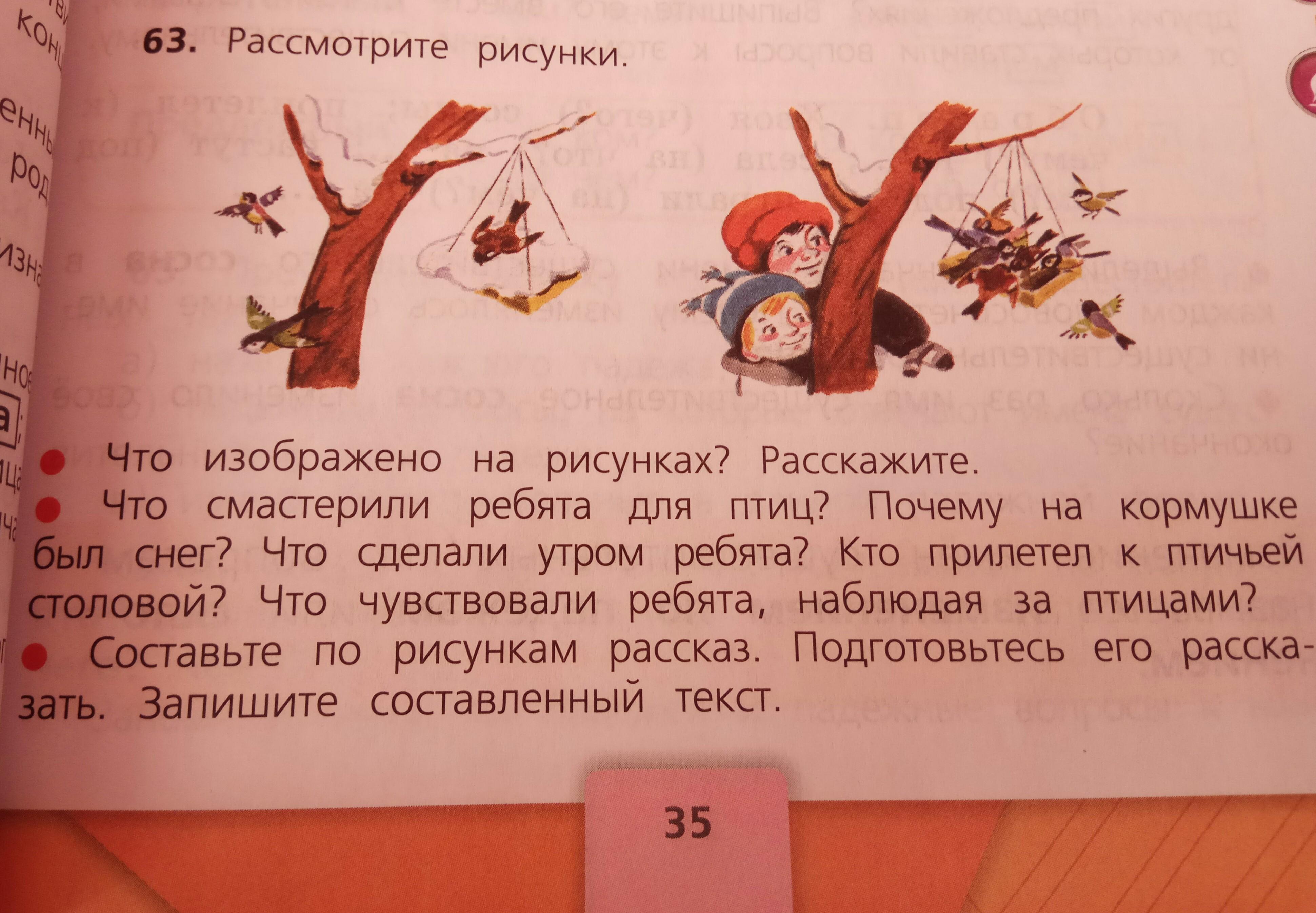 Что смастерили ребята для птиц? Почему на кормушке был снег?Что сделали утром ребята? Кто прилетел к птичьей столовой? Что чувствовали ребята, наблюдая за птицами? Составьте рассказ пожалуйста