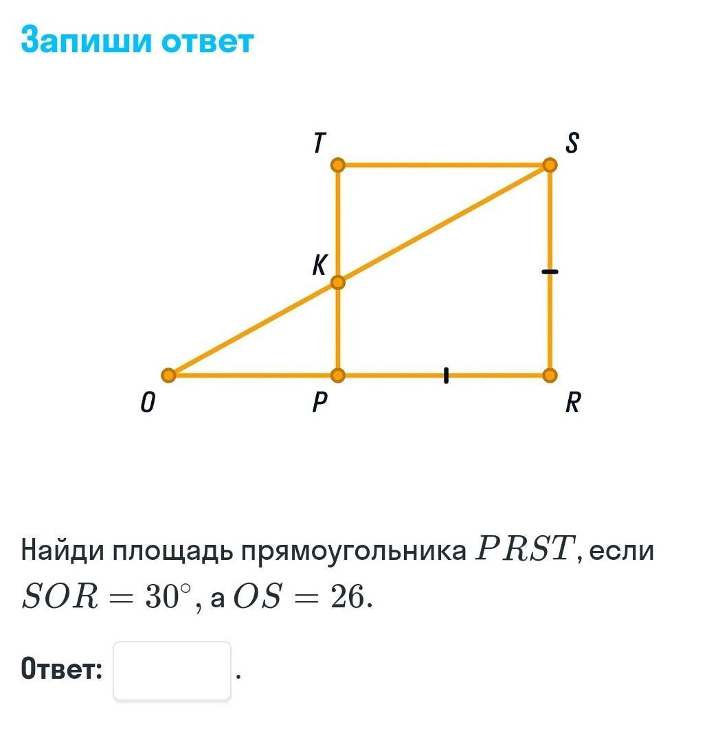 если SOR=30°, имеем свойство, катет который лежит напротив угла 30°=половине гипотенузы, так что SR = 13 см, SR=PR , у прямоугольника две противоположные стороны равны, так что 13×13=169