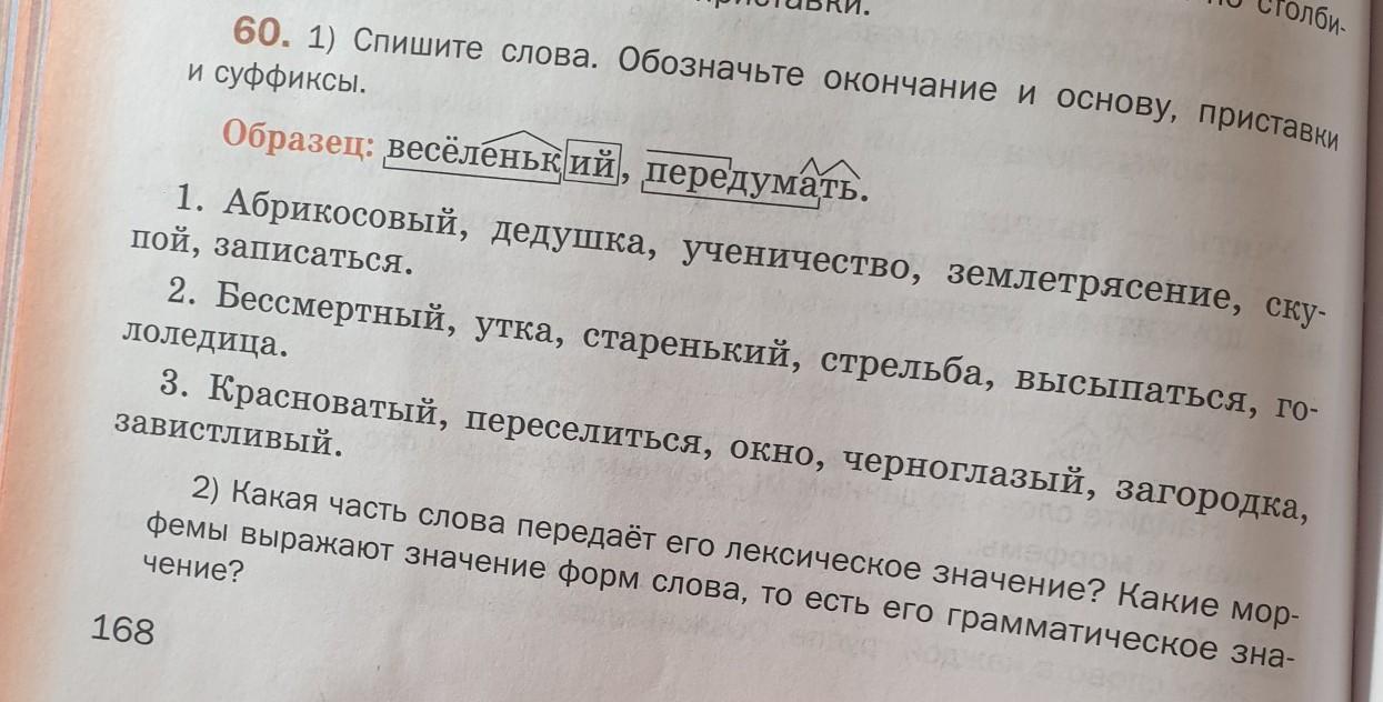 1) Спишите слова. Обозначьте окончание и основу, приставки и суффиксы. но Образец: весёленький, передумать.