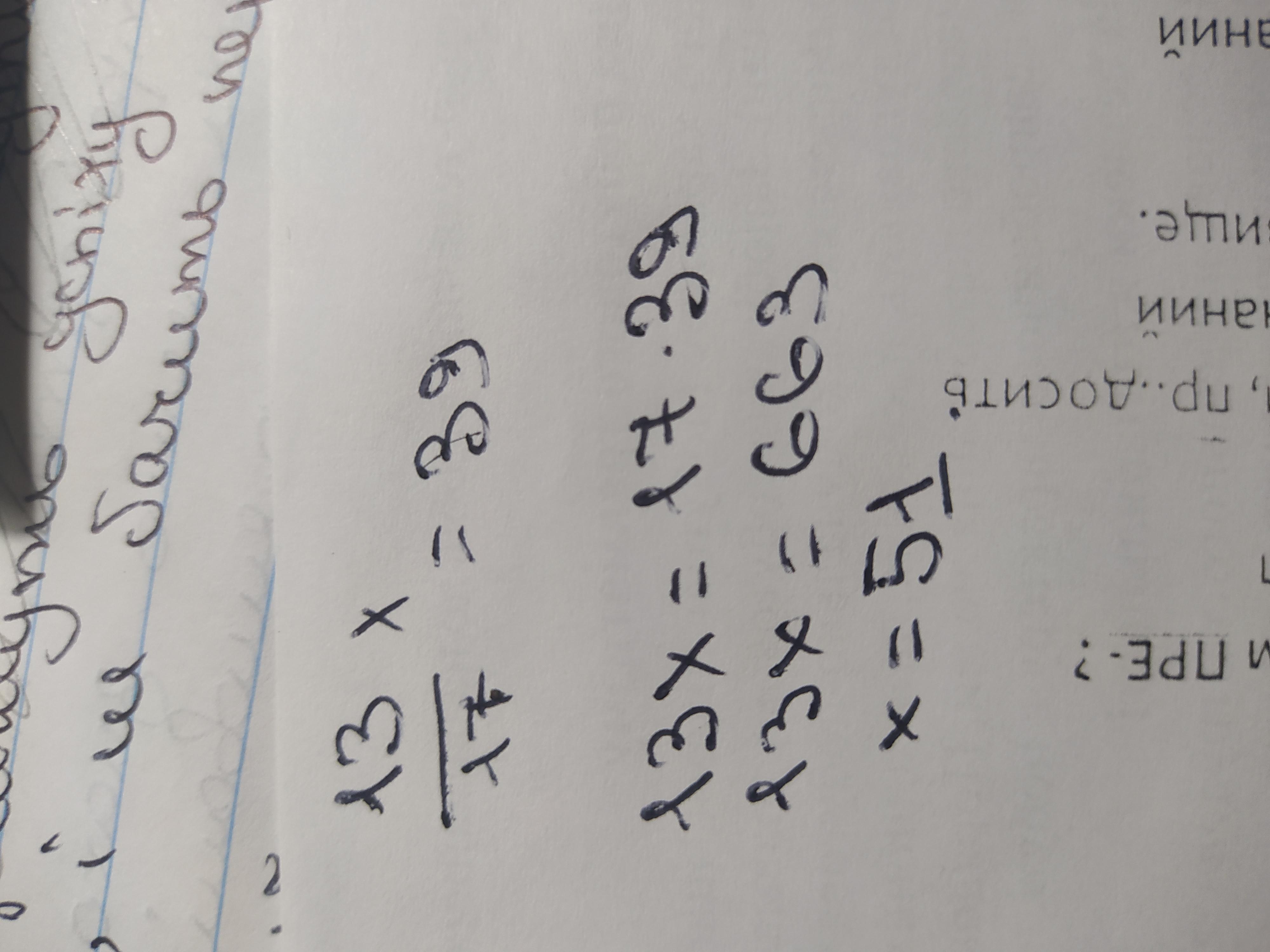 x = 39 : 13/17 = 39 * 17/13 = 3 * 17/1 = 3*17 = 51