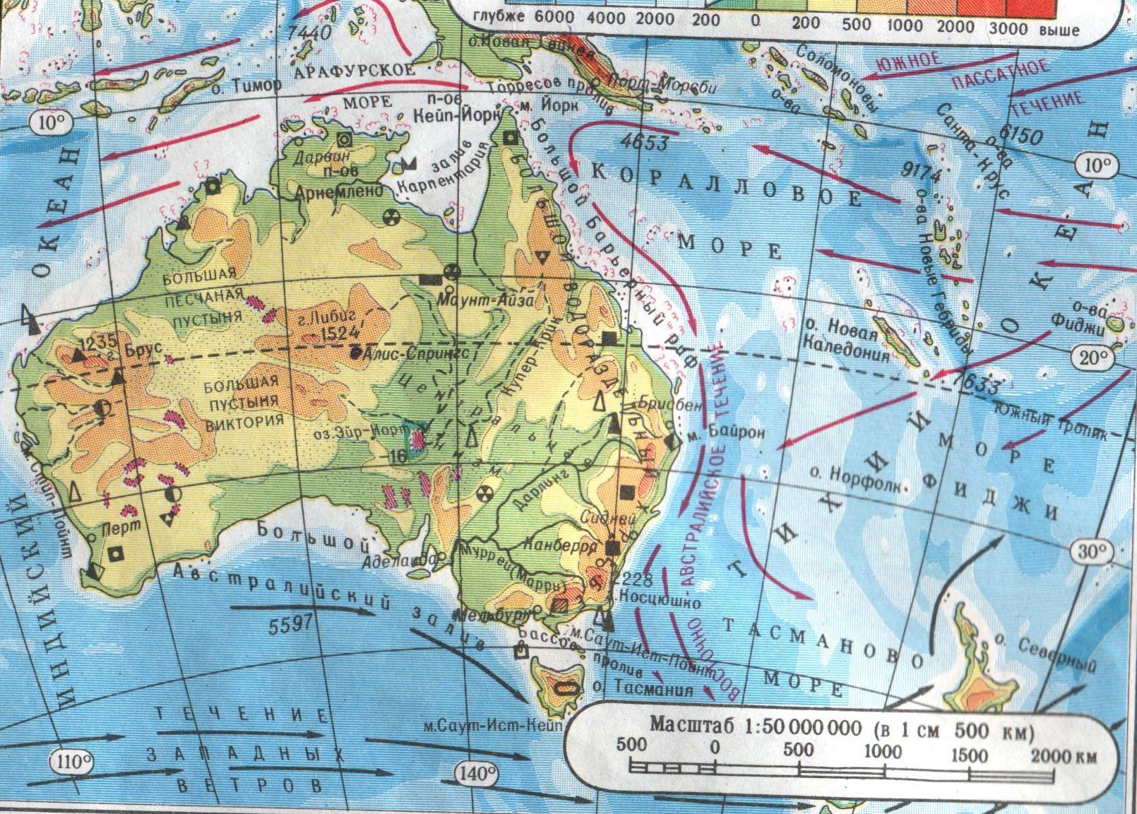 Из вышеперечисленных основных линий:экватор, Южный полярный круг, нулевой меридиан ни одна не пересекает Австралию.Её пересекает почти посередине Южный тропик.