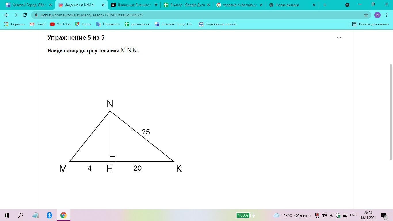NH=√(NK²-HK²)=√(25²-20²)=√(625-400)=