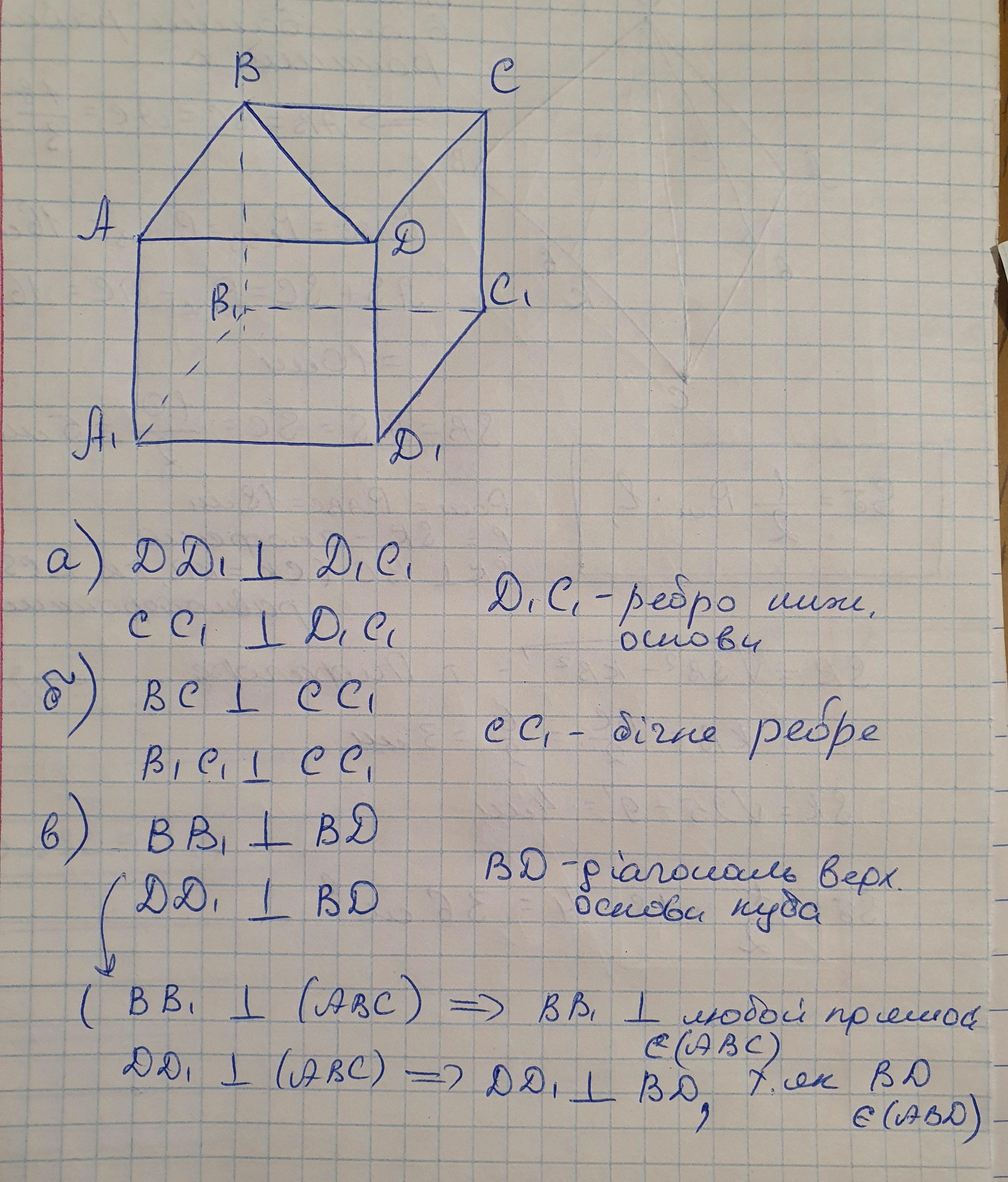 Зобразіть куб і позначте його вершини. Випишіть ребра, перпендикулярні до: а)одного з ребер нижньої основи; б)бічного ребра; в) діагоналі верхньої основи куба