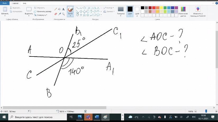угол BOC=180°-AOB1-AOC=180°-140°-15°=25°