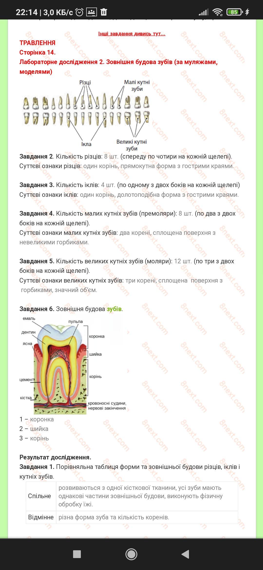 Лабораторне дослідження № 5 Тема: Зовнішня будова зубів (за муляжами, моделями) Огаднання: модель будови зуба, муляж щелепи людини, електронні Мета: вивчити будову зубної системи. Хід роботи посібники, підручник. 1. Розгляньте муляж щелеп людини. Скільки зубів на кожній щелепі? Розгляньте їх зовнішню будову. За допомогою підручника дайте їм 3. назву. Визначте, яку функцію виконують різні типи зубів. Доросла людина має 16 зубів на кожній щелепі, всього основні типи й кожний з них виконує певну Іх поділяють на функцію. а) — гострі передні зуби використовують для б) - конусоподібні зуби, які їжу. в) — тупі, широкі зуби необхідні для та їжі .
