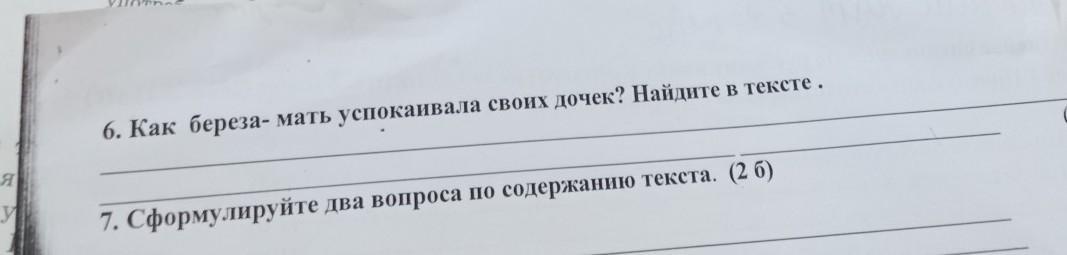 6. Как береза- мать успокаивала своих дочек? Найдите в тексте. 7. Сформулируйте два вопроса по содержанию текста. (2 б) сретсе мать