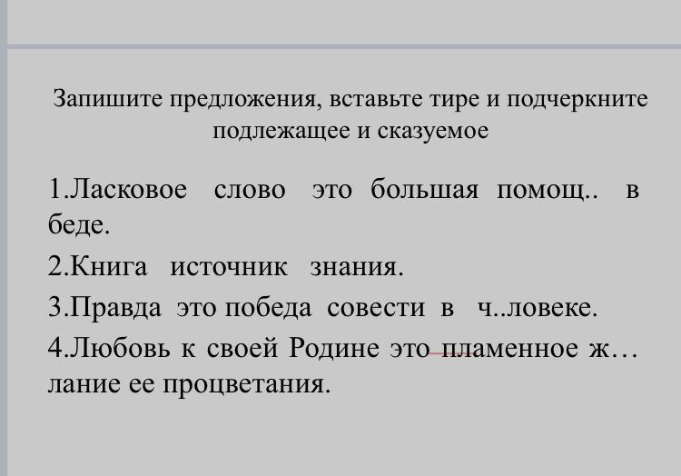 в первом предложении подлежащее слова подчёркивается одной чертой выраженное существительным , сказуемое в этом случае является помощь подчёркивается двумя чертами. во втором предложении подлежащее книга подчёркивается одной чертой, сказуемое источник подчёркивается двумя чертами . в третьем предложении существительное правда, сказуемое Победа совести. четвёртом предложении существительное любовь а сказуемое то есть глагол желание