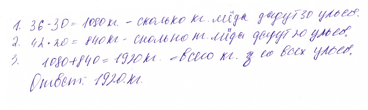 на пасеке 30 ульев дали за лето по 36 кг. меда и 20 ульев по 42 кг. Сколько всего кг. меда получили с этих ульев за лето?