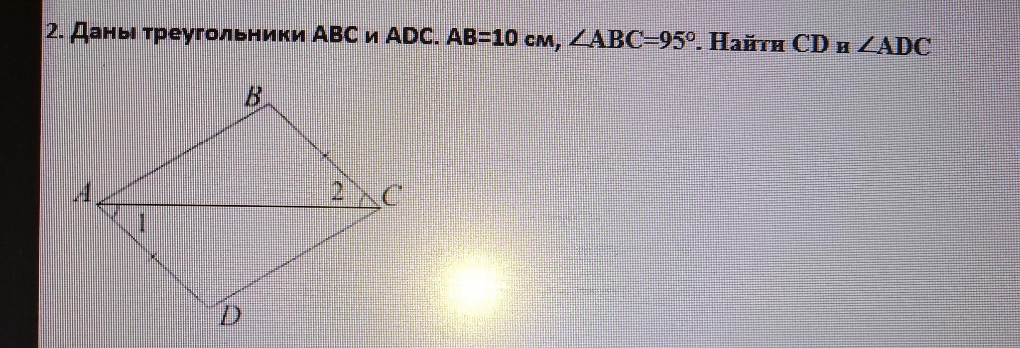 1) авс= адс по 2 признаку : ад= вс, ас - общая, угол а= углу с, следовательно у равных треугольников соответствующие элементы равны, сд= 10 см, адс = 95°