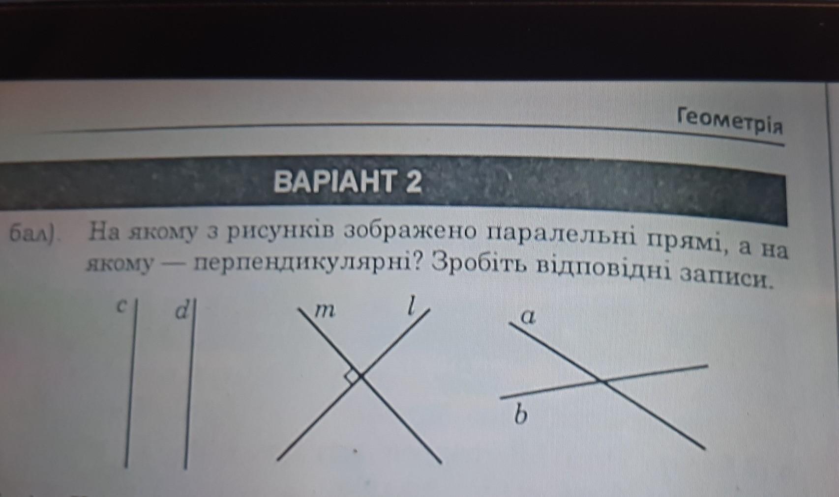 бал). На якому з рисунків зображено паралельні прямі, а на якому — перпендикулярні? Зробіть відповідні записи.