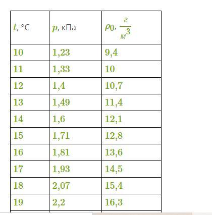 При температуре 13 °С относительная влажность воздуха была равна 72 %. Используя данные таблицы, определи, на сколько уменьшилась или увеличилась относительная влажность воздуха, если температуру повысили до 16 °С.