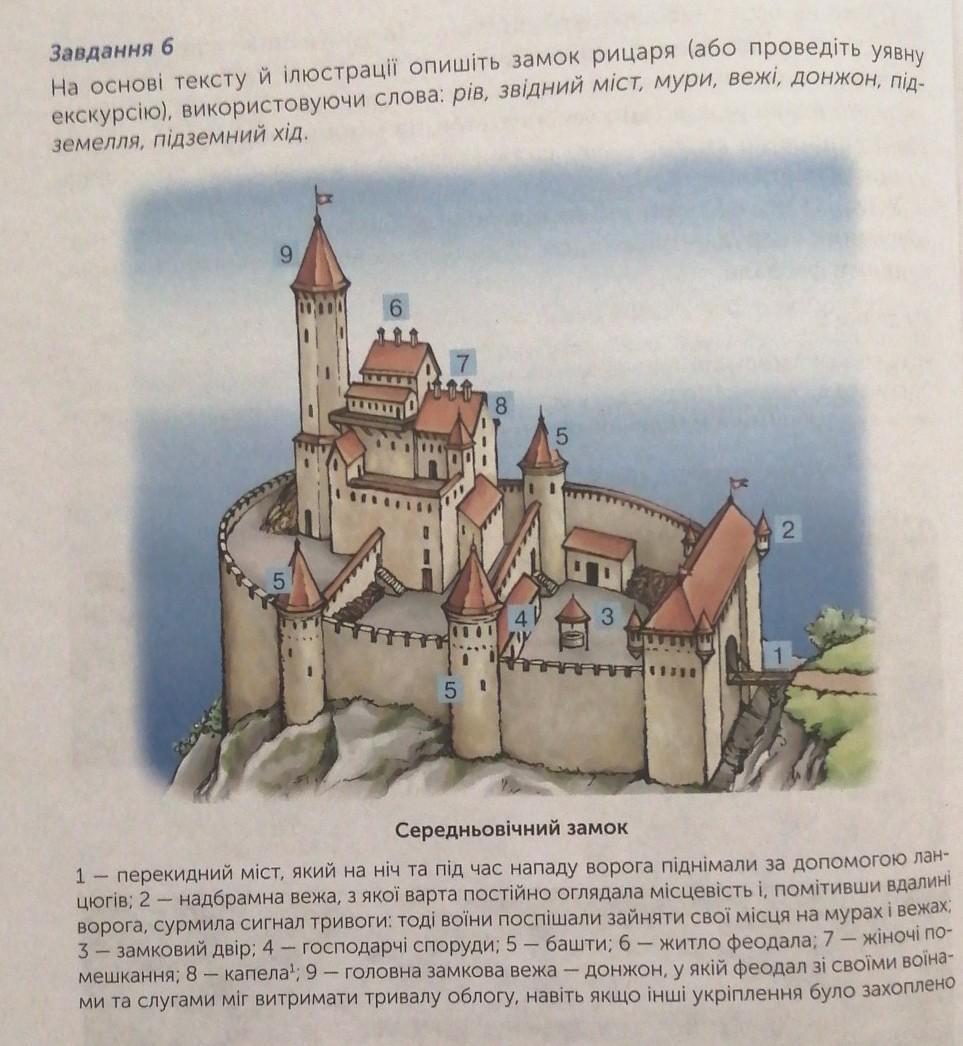 Опишіть замок рицаря,використовуючи слова:рів,звідний міст,мури,вежі,дондон,підземельний хід. Розповідь не менше 3 речень і не більше 10 речень