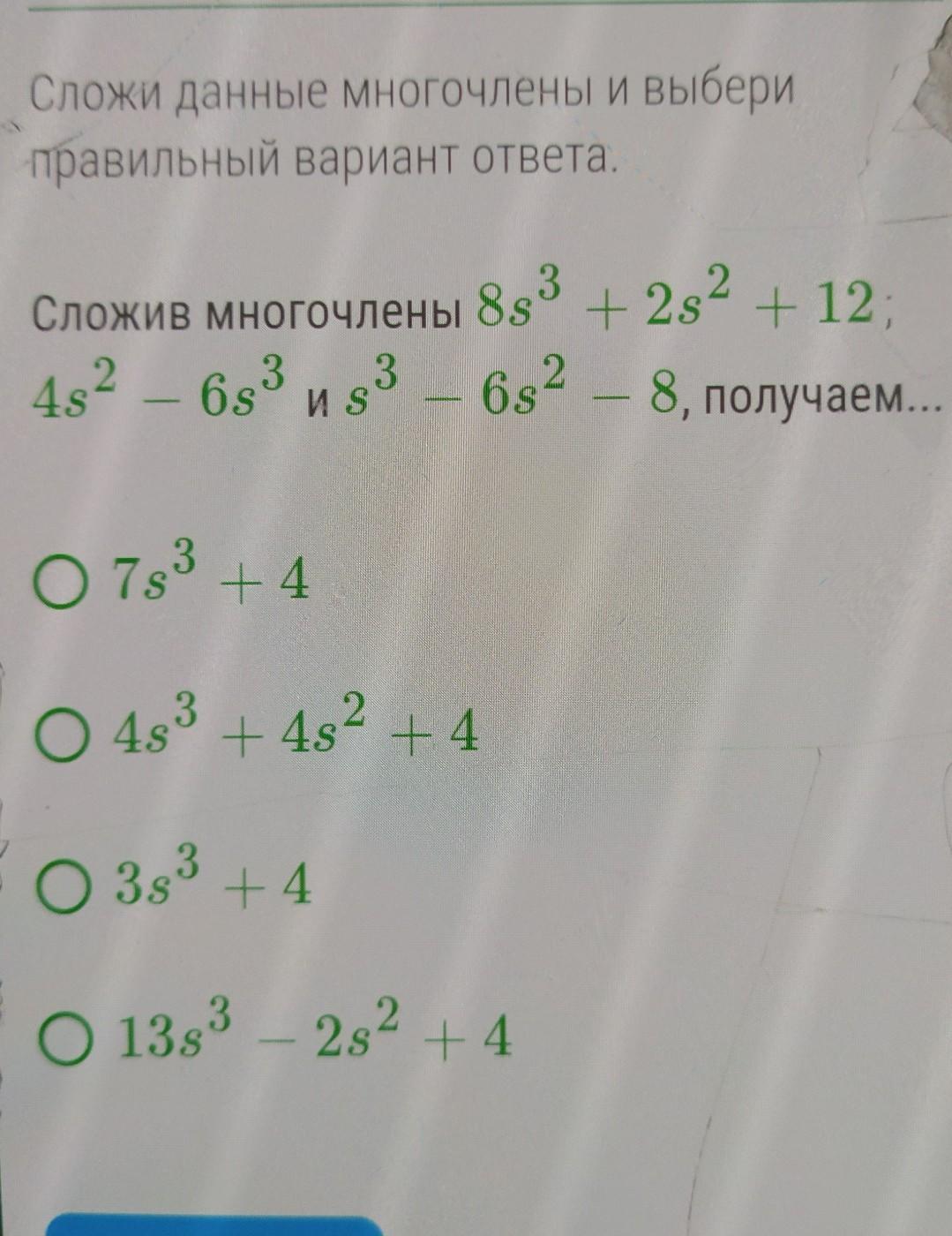 1 ) (8s^3 + 2s^2 + 12) + (4s^2 - 6s^3) = 2s^3 + 6 s ^ 2 + 12