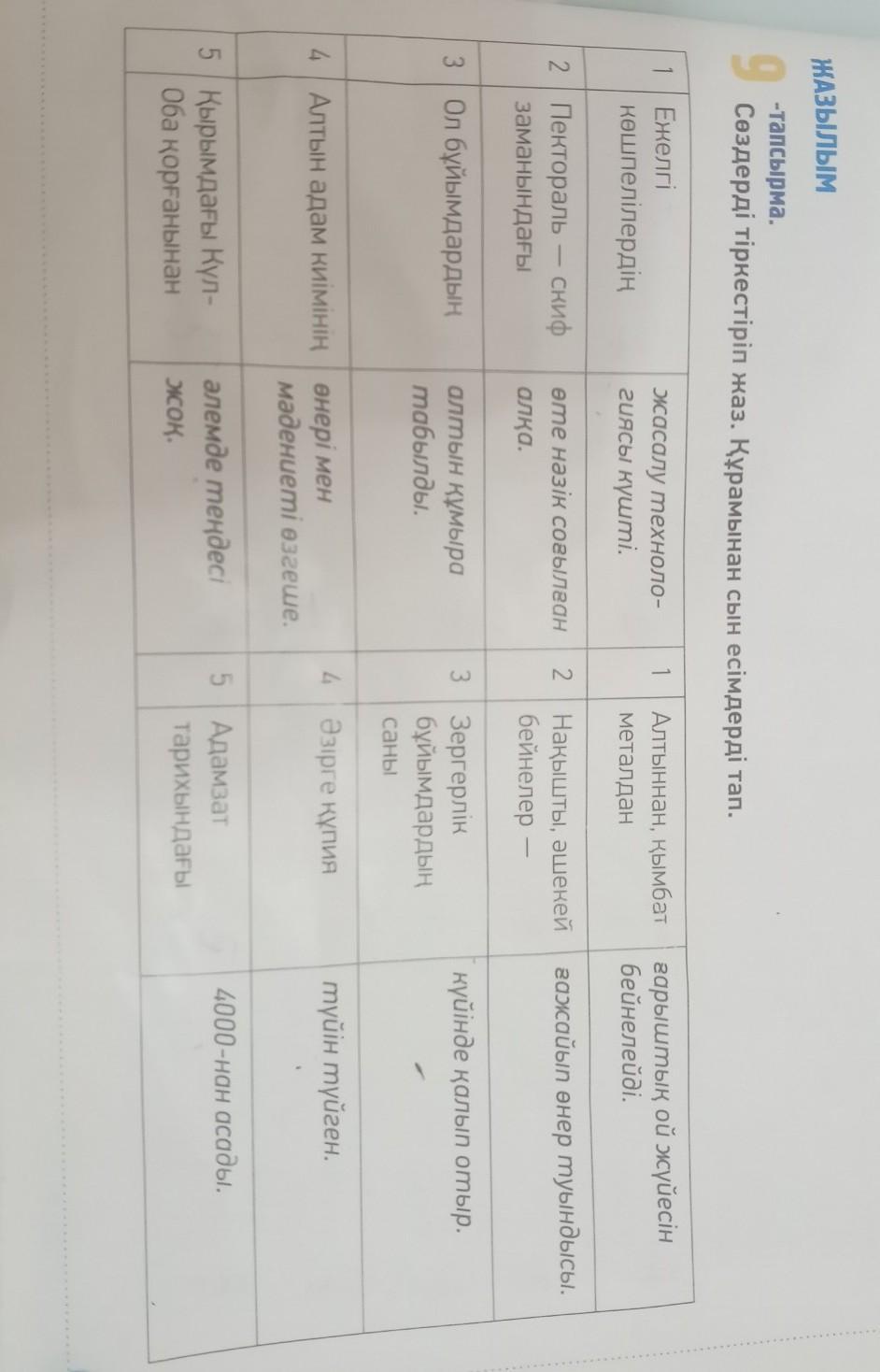 айтыңдар. Сөйлем құрай алмаған оқушылар өнер көрсетеді. ЖАЗЫЛЫМ 9 -тапсырма. Сөздерді тіркестіріп жаз. Құрамынан сын есімдерді тап. 1 1 Ежелгі көшпелілердің жасалу техноло- гиясы күшті. Алтыннан, қымбат металдан ғарыштық ой жүйесін бейнелейді. ғажайып өнер туындысы. 2 Пектораль — скиф | заманындағы өте нәзік соғылған алқа. 2 Нақышты, әшекей бейнелер — 3 3 Ол бұйымдардың 3 күйінде қалып отыр. алтын құмыра табылды. Зергерлік бұйымдардың саны 4 Әзірге құпия түйін түйген. 4 Алтын адам киімінің өнері мен мәдениеті өзгеше. 4000-нан асады. 5 | Қырымдағы Күл- Оба қорғанынан әлемде теңдесі жоқ. 5 Адамзат тарихындағы