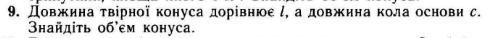 Довжина твірної конуса дорівнює l, а довжина кола основи c. Занйдіть об'єм конуса.