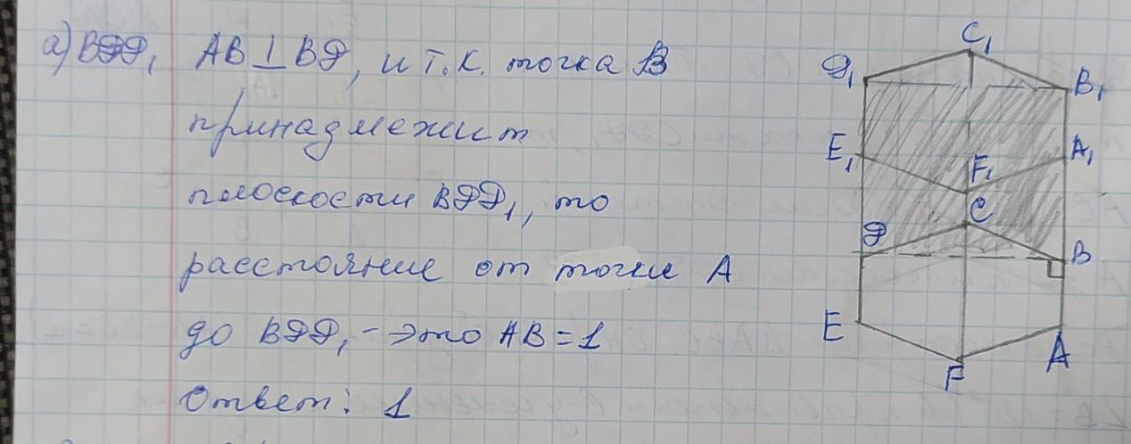 в правильной шестиугольной призмы ABCDEFA1B1D1E1 равны 1 (рис. 12.8).Найдите расстояние от вершины A до следующих плоскостей А) BDD1 б) BЕЕ1