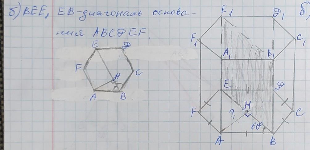 б) диагональ ВЕ является диаметром описанной окружности вокруг 6-угольника и является биссектрисой угла В и делит его пополам, поэтому ∠АВН =120÷2=60°. Проведём перпендикуляр АН к ВЕ, и получим прямоугольный треугольник АВН с прямым углом АНВ, катетами АН и ВН и гипотенузой АВ. Найдём АН, используя синус угла: