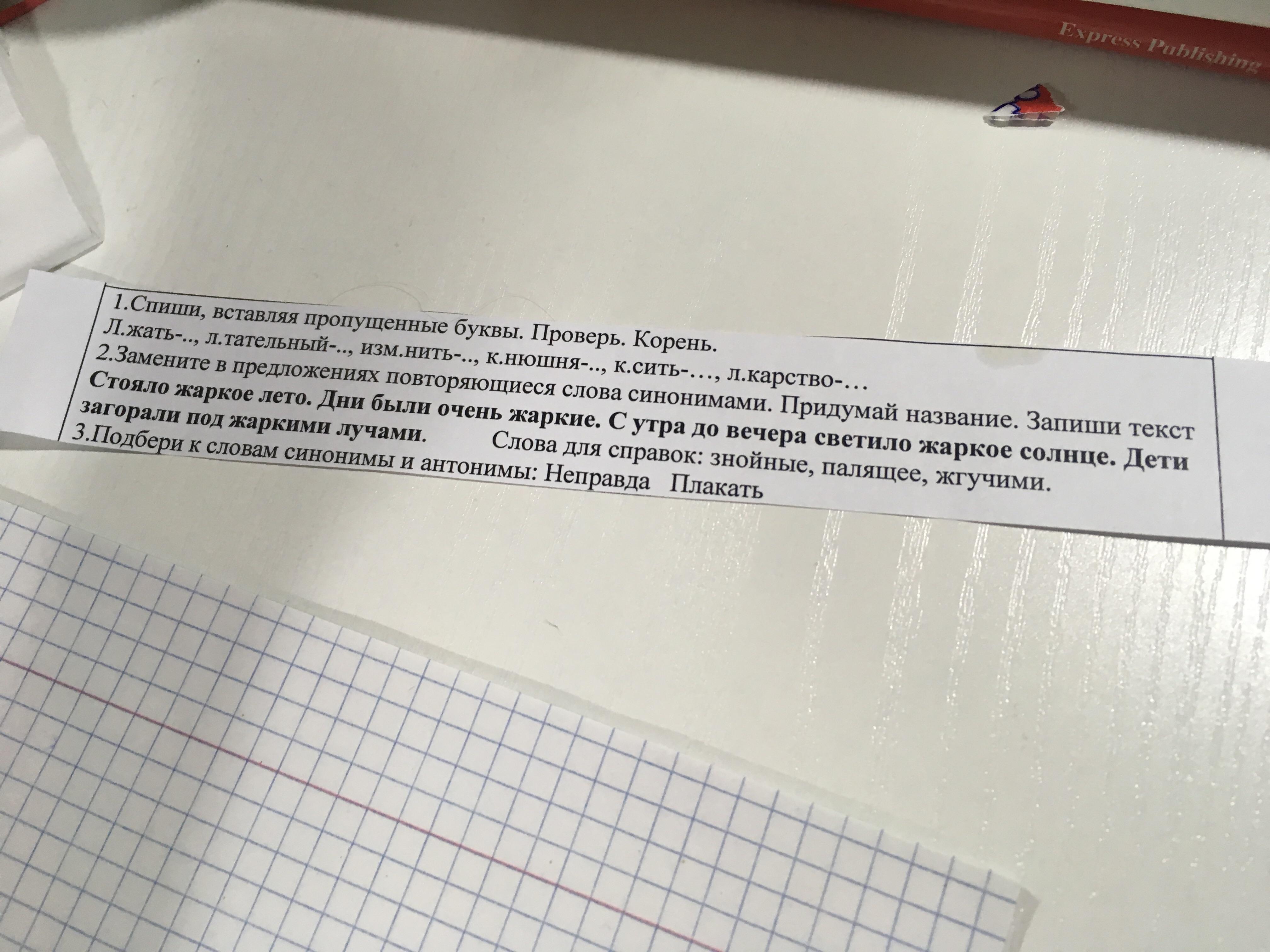 Помогите пожалуйста с русским языком. Там нужно: 1. Списать, вставить пропущенные буквы и проверить корень. 2. Заменить в предложениях повторяющиеся слова синонимы придумать название и записать текст. Т Заменить в предложениях повторяющиеся слова синонимы придумать название и записать текст. 3. Подобрать к словам синонимы и Антонимы