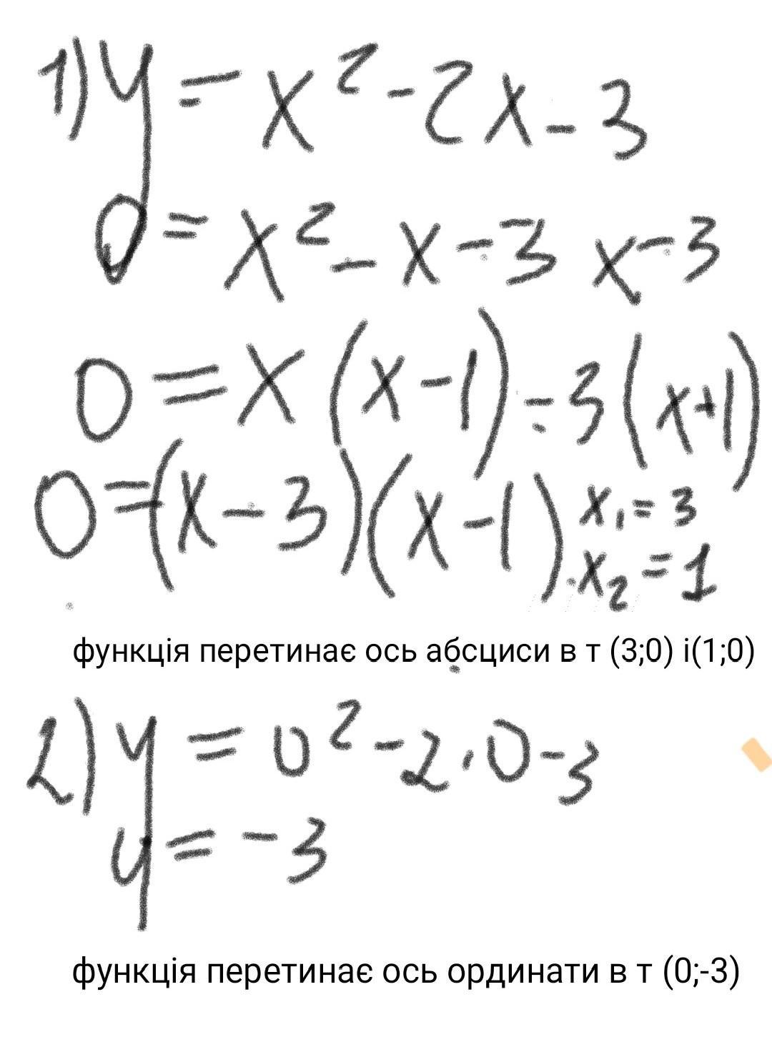 функція перетинає ось абсциси в т (3;0) і(1;0), а ось ординати в т (0;-3)