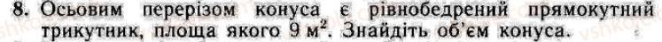 Осьовим перерізом конуса є рівнобедрений прямокутний трикутник, площа якого 9м². Знайдіть об'єм конуса.