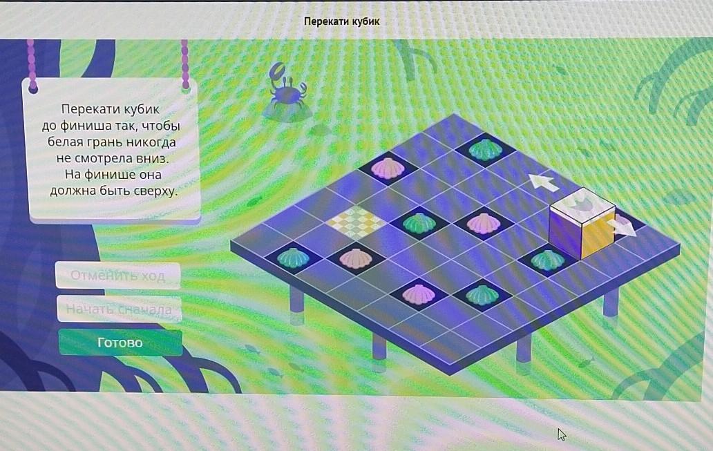Нужно этот кубик довести до финиша так, чтобы белая сторона, которая сейчас сверху, не дотрагивалась до поля