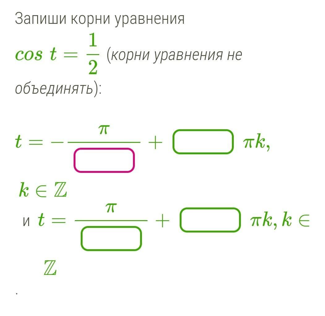 Косинус 60 равен 1/2. 60 это π/3. Косинус -60 тоже равен 1/2. А ещё корни эти оба повторяются через каждые 360 градусов (через каждый оборот). А 360 это 2π.