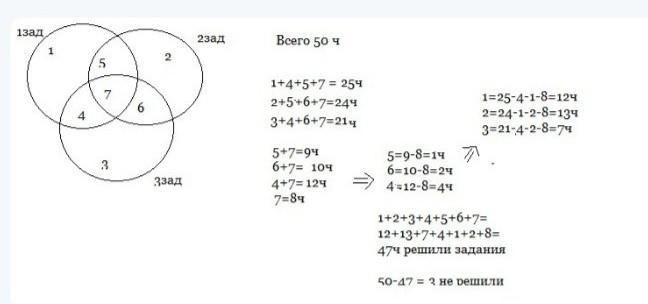 Из 50 участников олимпиады по информатике, первую задачу решило 25 человек, вторую - 24, третью - 21. Первую и вторую задачи решило 9 человек, вторую и третью - 10, первую и третью 12 человек, все три задачи - 8. Сколько участников не решили ни одной задачи?