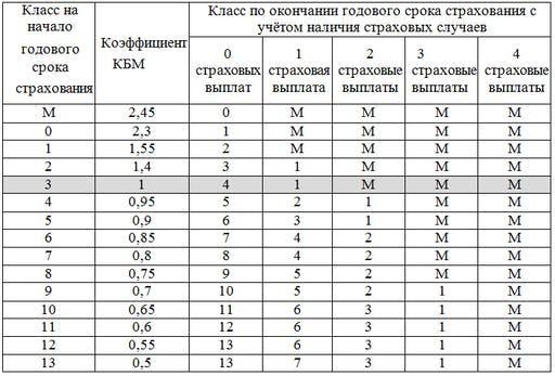 Коэффициент бонус-малус (КБМ) зависит от класса водителя. Это коэффициент, понижающий или повышающий стоимость полиса в зависимости от количества ДТП в предыдущий год. Сначала водителю присваивается класс 3. Срок действия полиса, как правило, один год. Каждый последующий год класс водителя рассчитывается в зависимости от числа страховых выплат в течение истекшего года, в соответствии со следующей таблицей.
