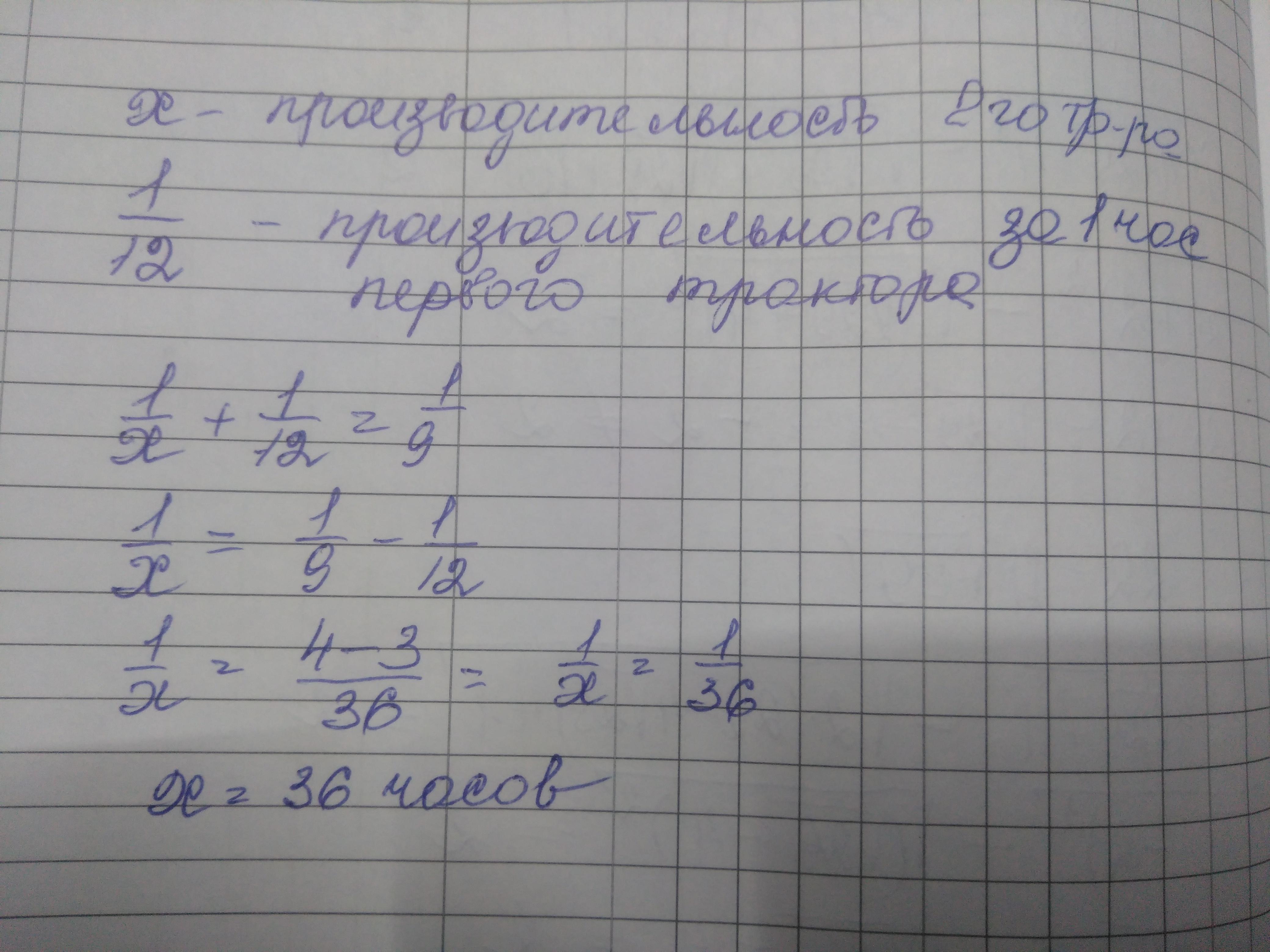 Два трактора могут вспахать поле за 9 часов. Первый трактор, если бы он работал один, вспахал бы это поле за 12 часов. За сколько часов вспахал бы это поле второй трактор?