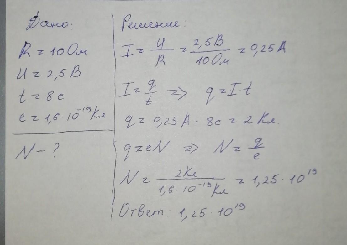 Даю 10 баллов но только ответь с дано с формулой и решением К концам проводника сопротивлением 10 Ом дано напряжения 2,5 В. Какое количество электронов пройдёт через поперечная сечения провадника за 8 с?