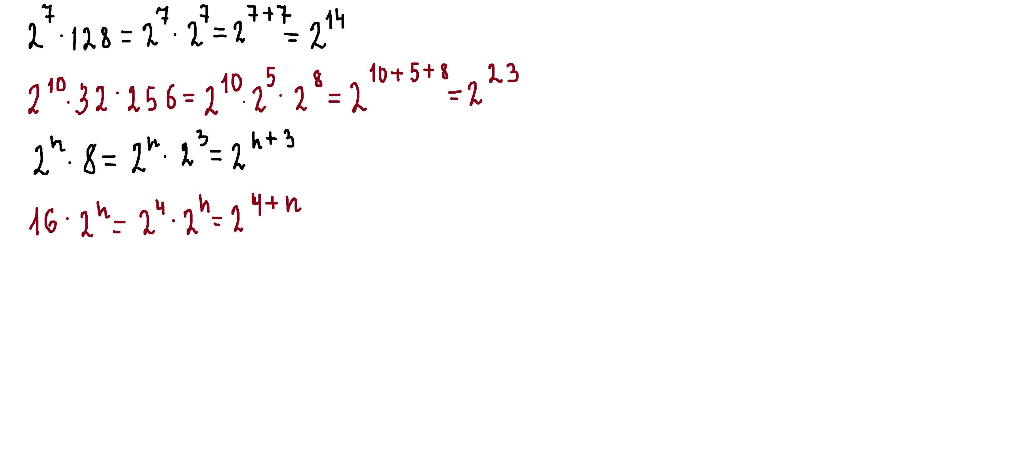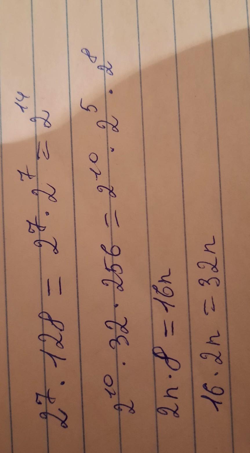 1)2⁷*128 2)2¹⁰*32*256 3) 2n*8 4) 16*2n (n — натуральное число) запишите в виде степени с основанием 2