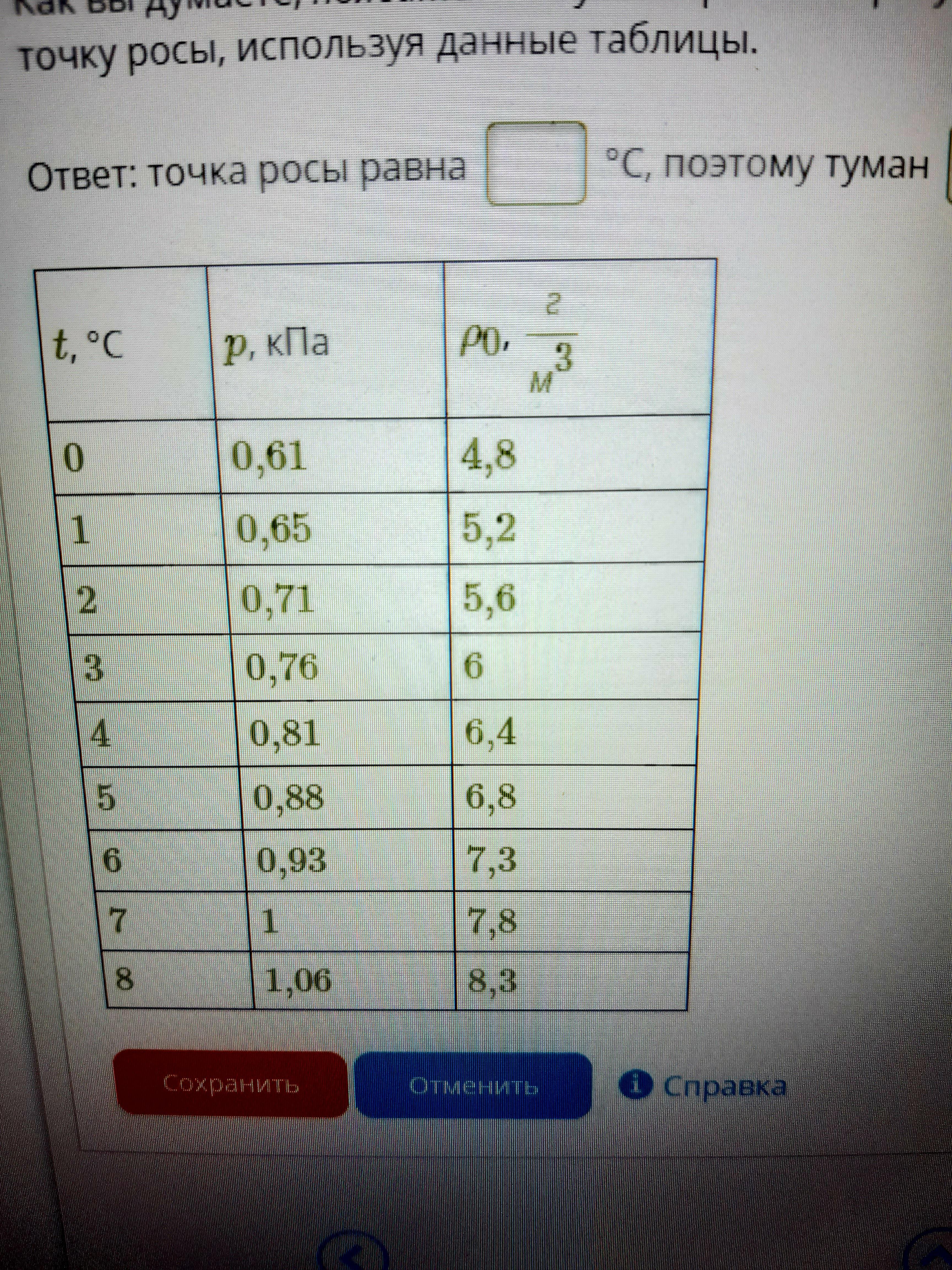 2. Как вы думаете, появится ли туман при температуре воздуха 3 °С и относительной влажности 80 %? Определите точку росы, используя данные таблицы.