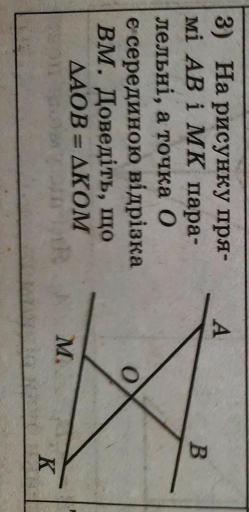Т.к. AB || MK, то угол OMK = ABO, угол OKM = BAO, угол OMA = AOB (как вертикальные). Если все углы равны, то и треугольникм равны