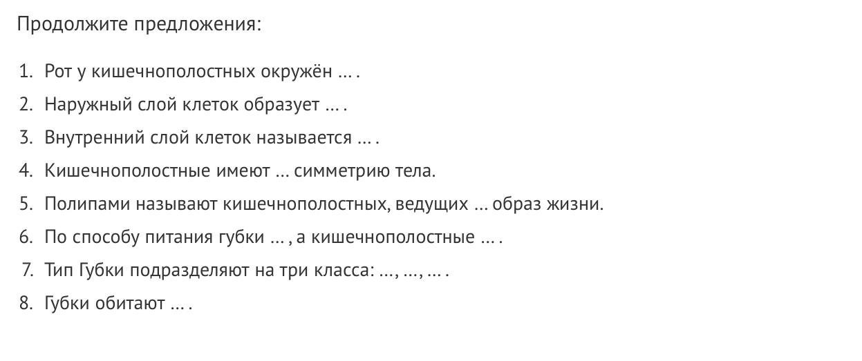 6.губки фильтраторы(фильтрация), кишечнополостные хищники
