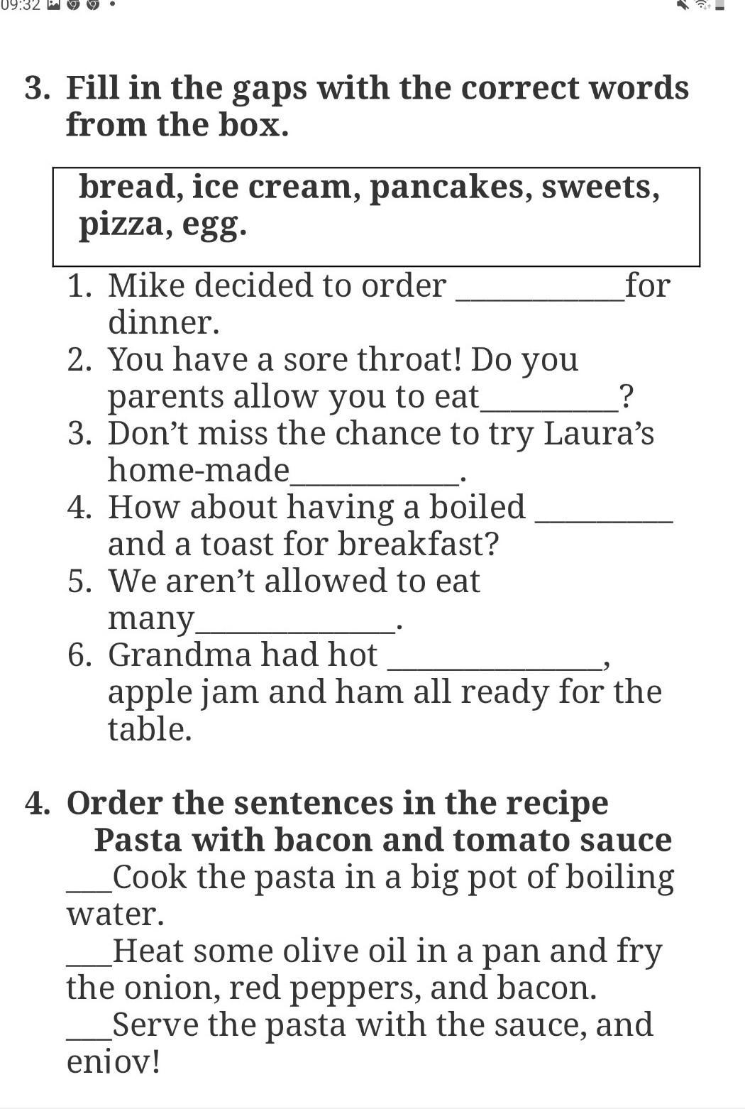 1. 1. Pizza. 2. Ice cream 3. Pancakes. 4. Egg. 5. Sweets 6. Bread