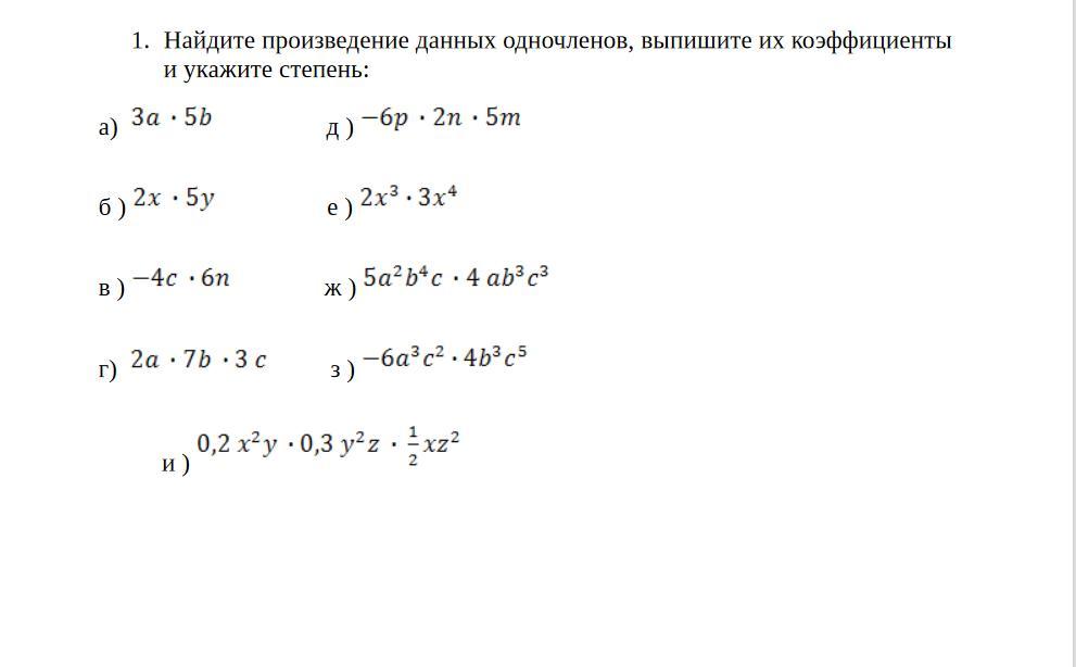 Е) 2x³*3x^4=6x^7 k=6 c.= 7 Ж) 5a²b^4c*4ab³c³=20a³b^7c^4 k=20 c.=14