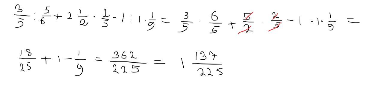Вычислить пожалуйста помогите 3/5:5/6+2 1/2×2/5-1:1 1/9=