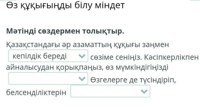 Қазақстандағы әр азаматтың құқығы заңмен кепілдік береді сөзіме сеніңіз. Кәсіпкерлекпен айналысудан қорықпаңыз, өз мүмкіндігіңізді шектемеңіз. Өзгелерге де түсіндіріп белсенділіктерін арттырыңыз.