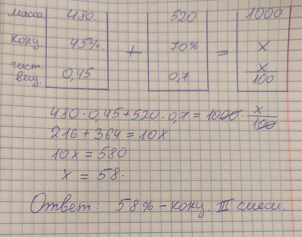 Раствор массой 480 мл и 45% концентрацией сахара смешали с другим раствором, масса которого 520 мл, а концентрация сахара в нем составила 70%. Найдите концентрацию полученной смеси. ПОМОГИТЕ ПОЖАЛУЙСТА СРОЧНО!!