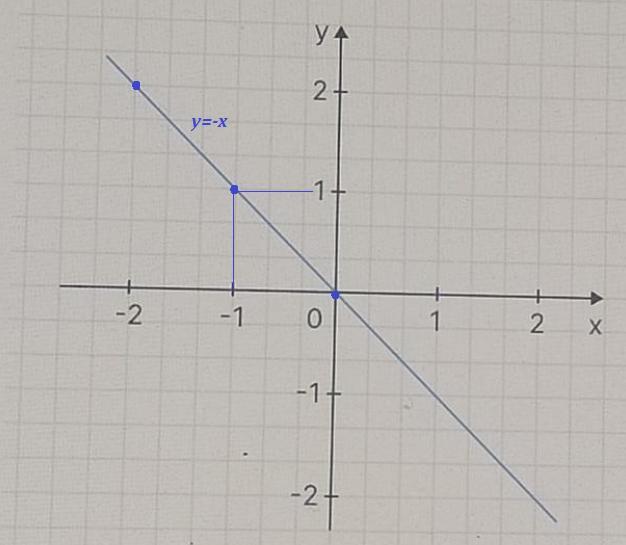 Судя по расположению графика коэффициент, при переменной х отрицательный, график проходит через начало координат значит свободный член равен 0. График проходит через точку (1; - 1) значит k= - 1, получим уравнение у= - х