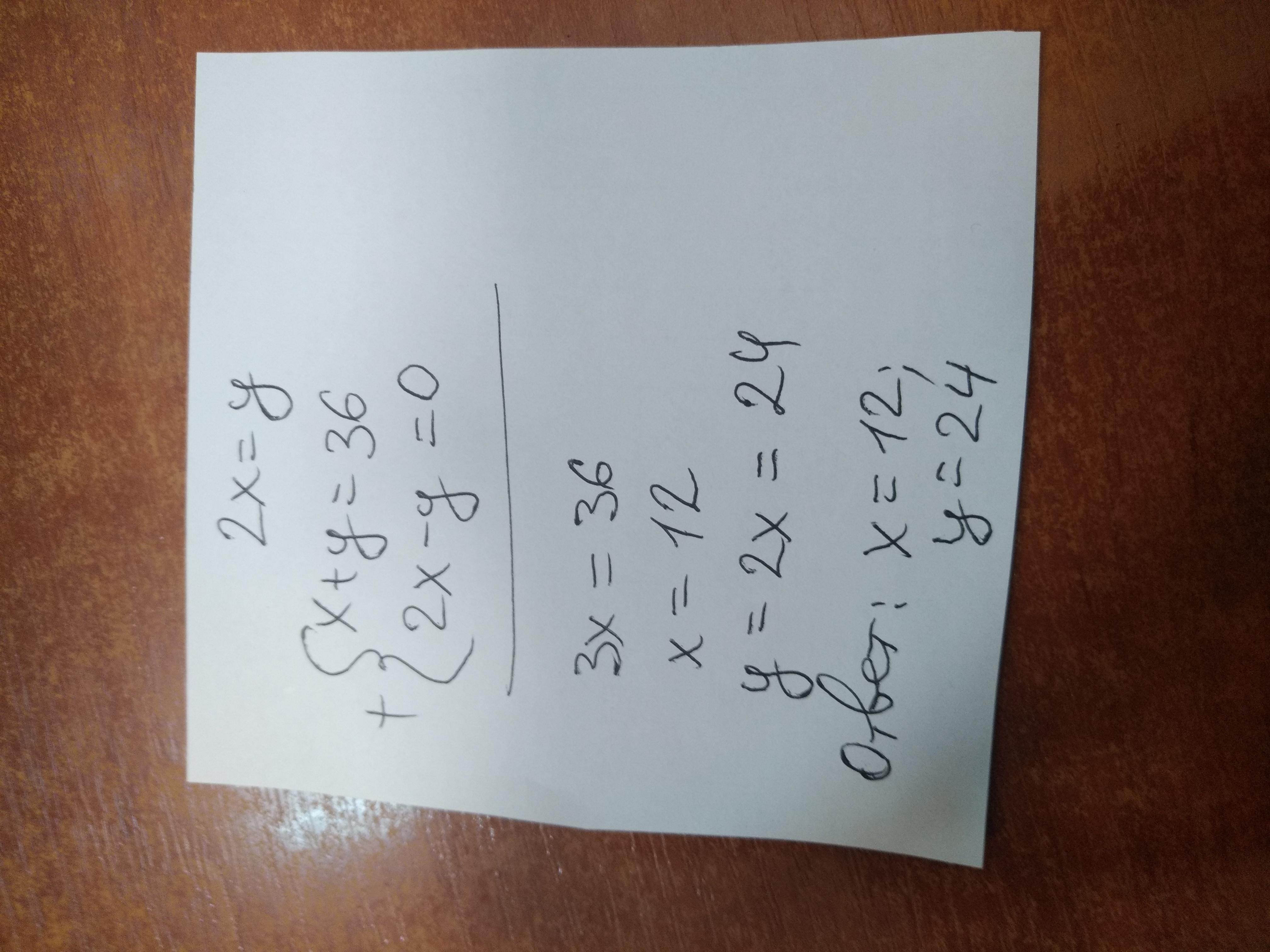 Сумма двух чисел равна 36.Одно из них в 2 раза больше другого.Найдите оба числа. Решите системой уравнения.Методом сложения.