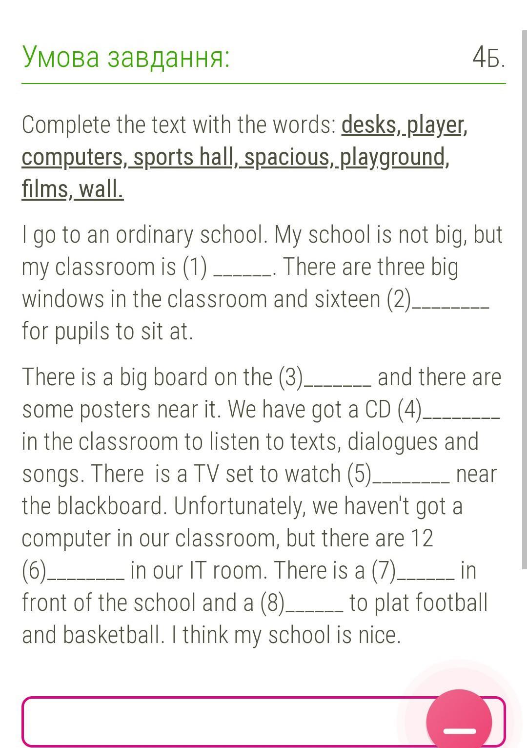 1 spacious 2 desks 3 wall 4 playground 5 films 6 computers 7 sports hall8 players