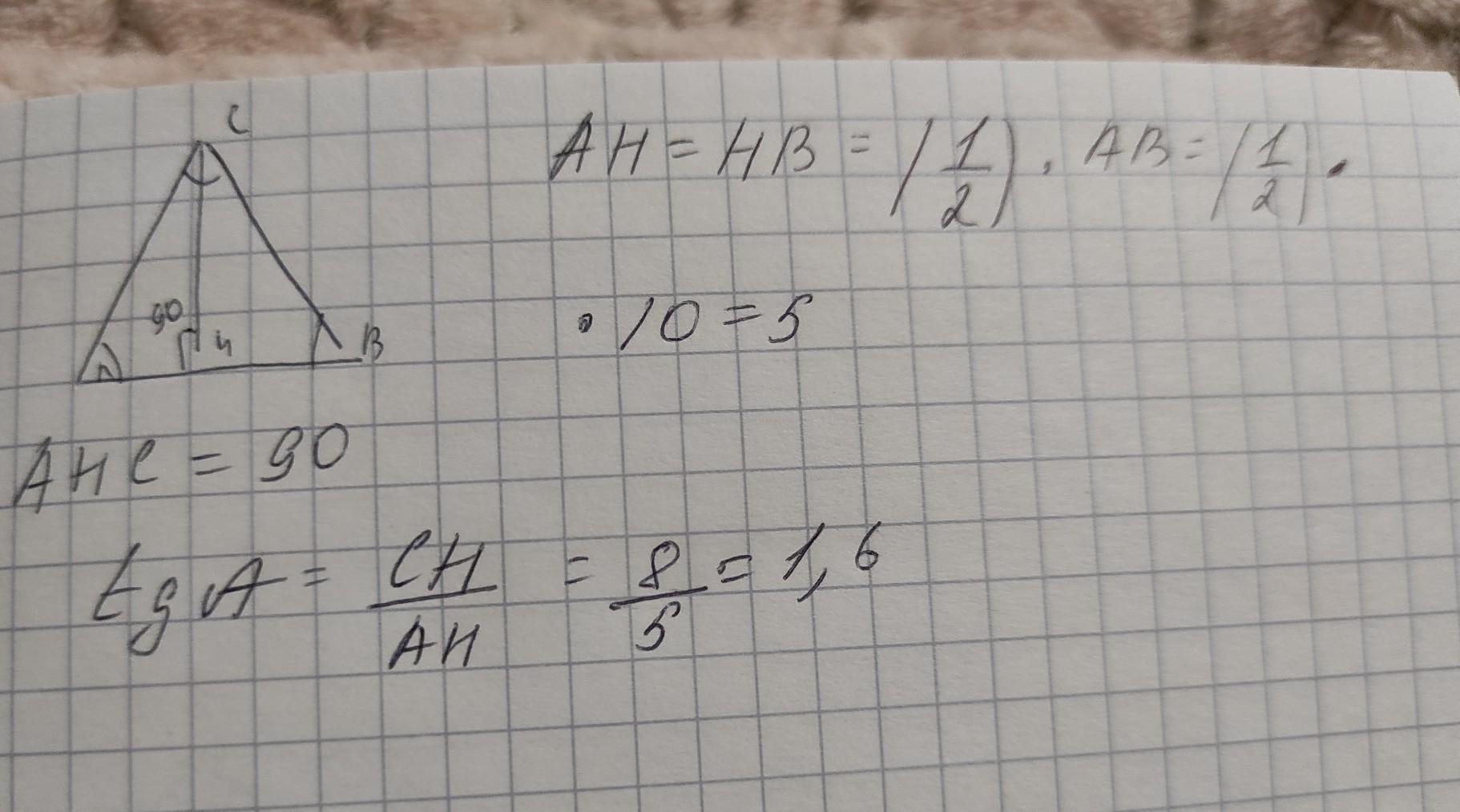 В равнобедренем треугольнике АВС (АС-ВС) Основание равно 10,высота, опущенная на основание, равна 8.Найдите тангес угла А.